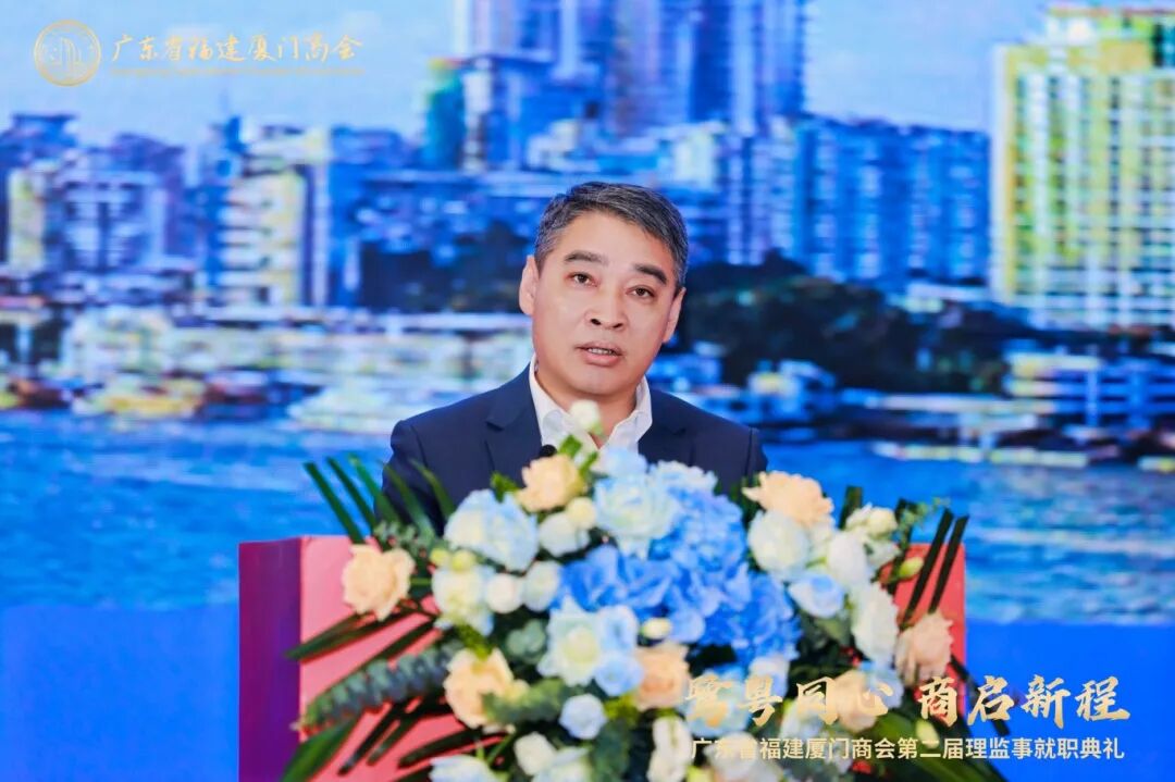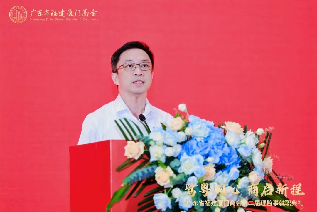 厦门市委统战部副部长、厦门市工商联党组书记、常务副主席陈永东上台致辞。他代表厦门市委统战部、市工商联向以李永毅为会长的新一届领导班子表示热烈祝贺,并向在粤厦门乡贤和各界友人致以诚挚问候。陈永东书记充分肯定了厦门商会自2022年成立以来在促进粤闽合作、服务会员发展、深化区域联动、践行社会责任等方面取得的显著成效,称赞商会已成为展示厦门企业实力与风采的重要窗口。他特别提到,厦门正开展综合改革试点,全力打造营商环境标杆城市,诚邀广大乡贤回乡投资兴业。他希望商会充分发挥桥梁纽带作用,做好厦门"代言人"、投资"领头雁"和人才"联络员",为厦门高质量发展注入新动能。